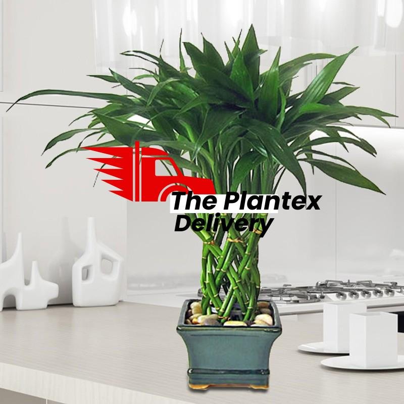Braided Pineapple Lucky Bamboo, this lucky bamboo arrangement features a braided arrangement shaped in a single tower. A space saver, this lucky bamboo arrangement fits easily on a desk or counter. This variety of lucky bamboo produces larger, greener leaves at the tips. Lucky bamboo arrangement.